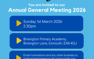 Annual General Meeting You are invited to join our Annual General Meeting on Sunday 1st March 2026 at 1.30pm. Venue: Brixington Primary Academy, Exmouth, EX8 4QJ Email nominations and any other business to jok@centrestageexmouth.onmicrosoft.com by 20th February 2026. Refreshments will [...]